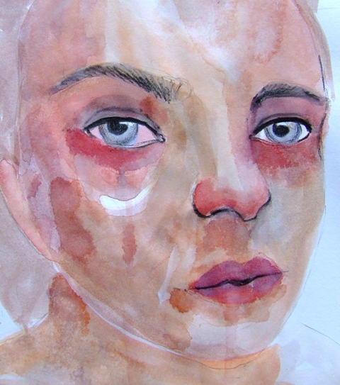 Recently I experienced the unpleasantness of having a bug in my eye – it flew in while I was reading my book and I couldn’t get it out. I thought it best to go to sleep, hoping that the bug would make it’s way out of my eye by morning…it didn’t…as a result my eye was so swollen I almost couldn’t open it. This watercolour is based upon a photo I took the morning after, the technique is inspired by Cherry Hood’s awesome watercolour portraits.